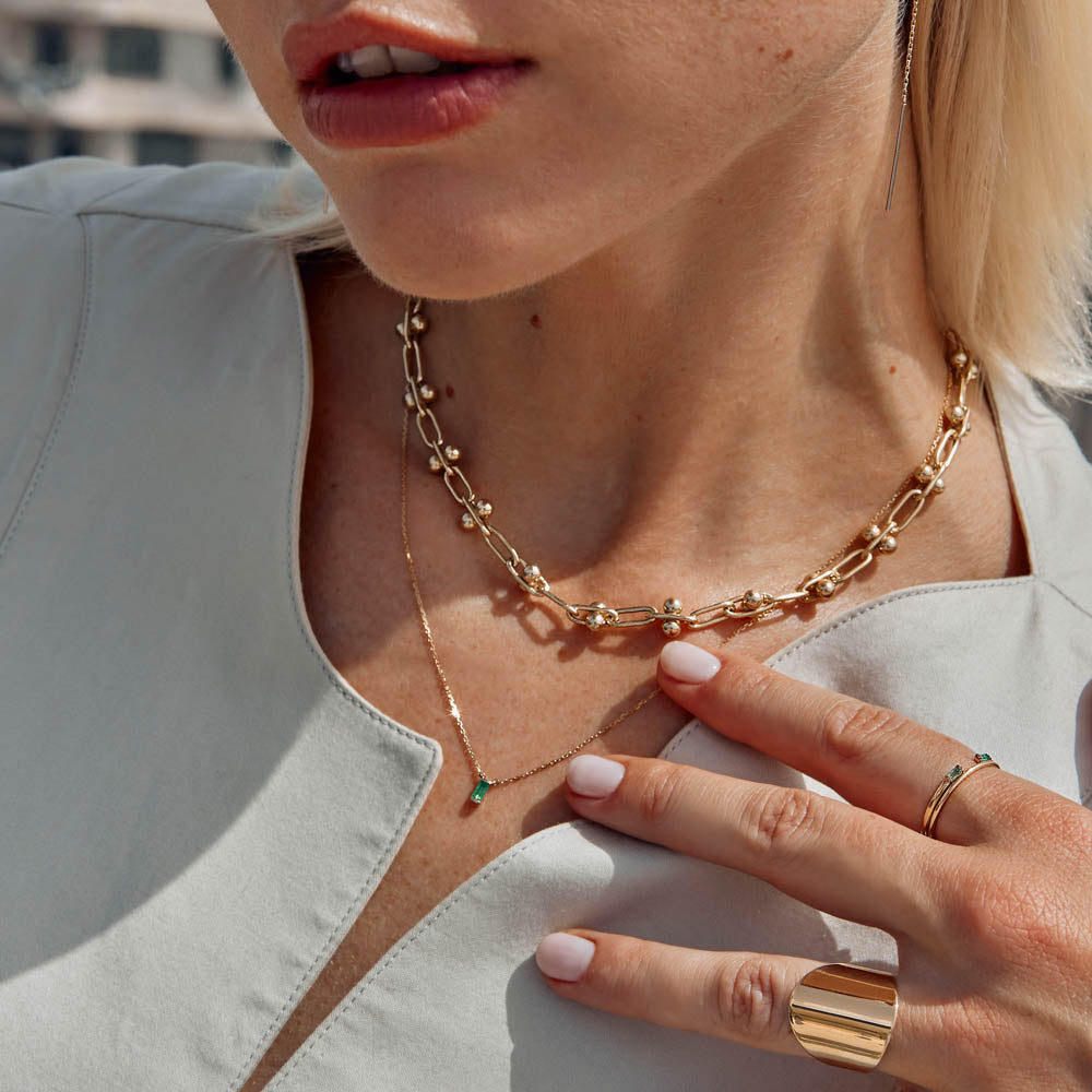 Allow your natural emerald piece to be the focal point of your jewellery look, by styling an emerald necklace or emerald huggie earrings on their own. Pair back with an outfit in neutral tones to really let the rich green colour pop.
