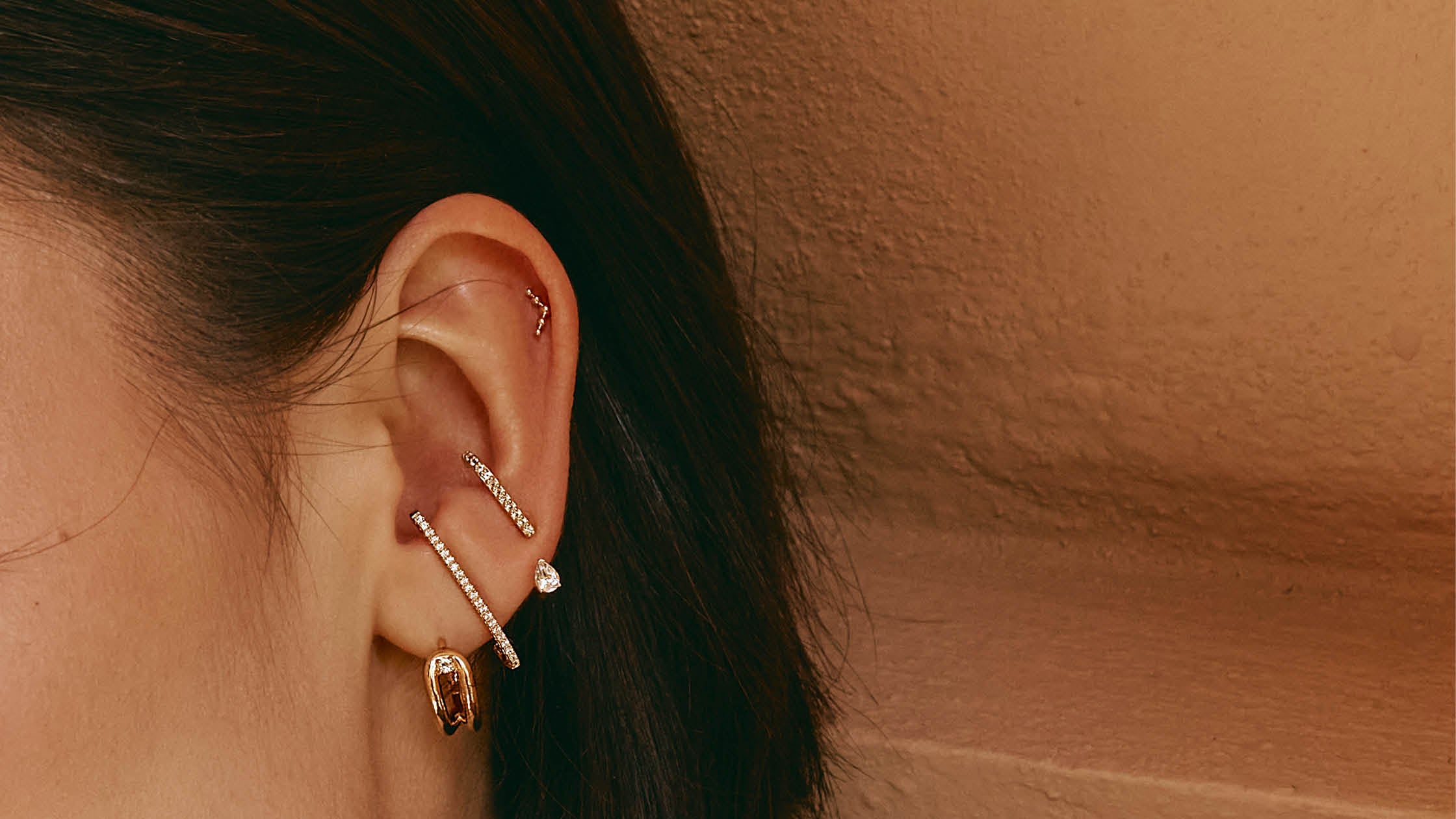 To stack earrings for a clean look, you should start with a large hoop on your first piercing, and layer different huggies and studs in your remaining piercings. Wearing your earrings in a descending order, largest to smallest. Mix and match diamond studs, cartilage earrings and ear cuffs for the ultimate stacked ear look!