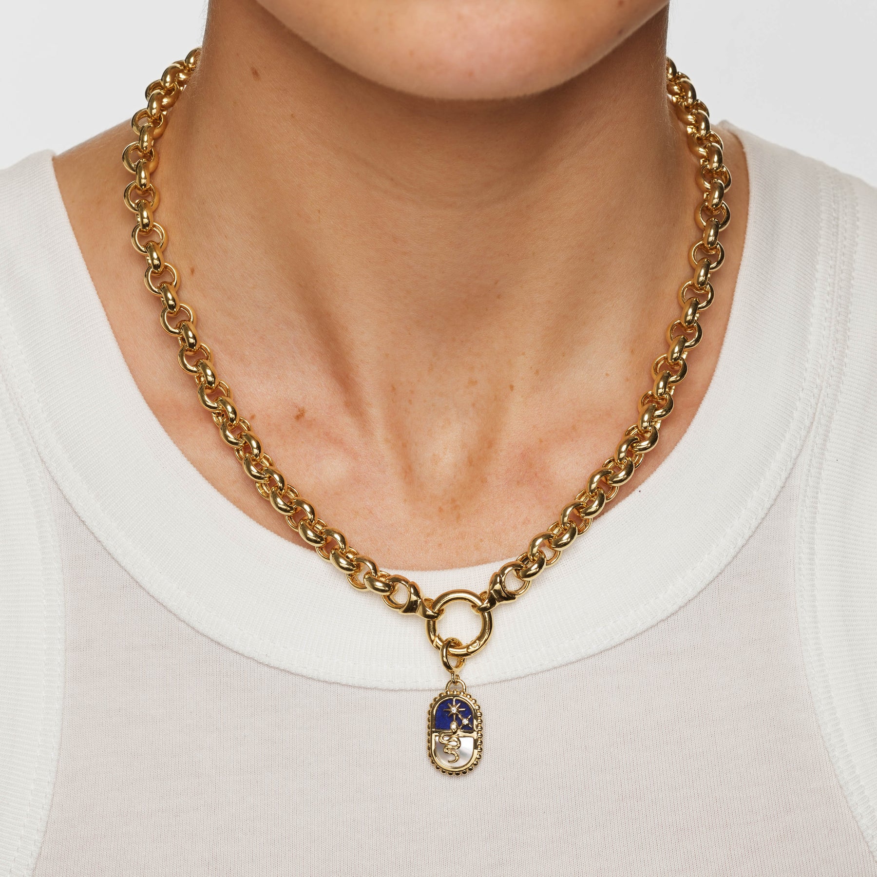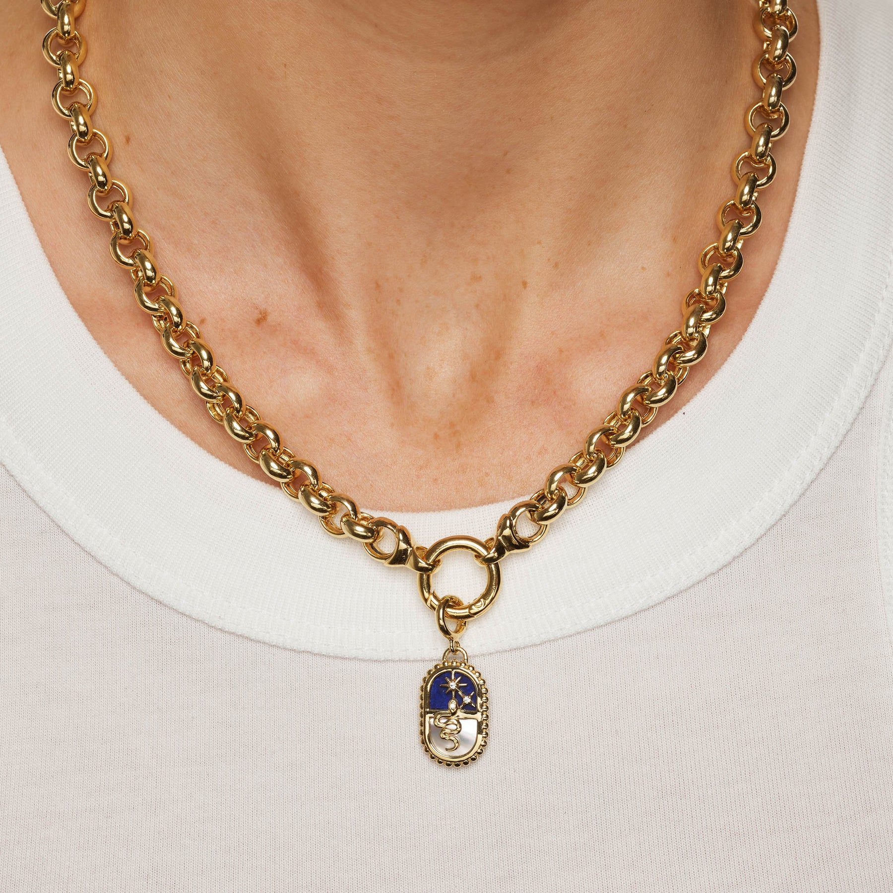 Bring a unique touch to your look with this gemstone serpent pendant. This snake charm tablet pendant is crafted in 18k fine gold plating, with white topaz, mother of pearl, and lapis. Slide it onto your favourite chain, or attach using our using our pendant connectors. Also pairs perfectly with our specially-designed charm bracelets and necklaces.