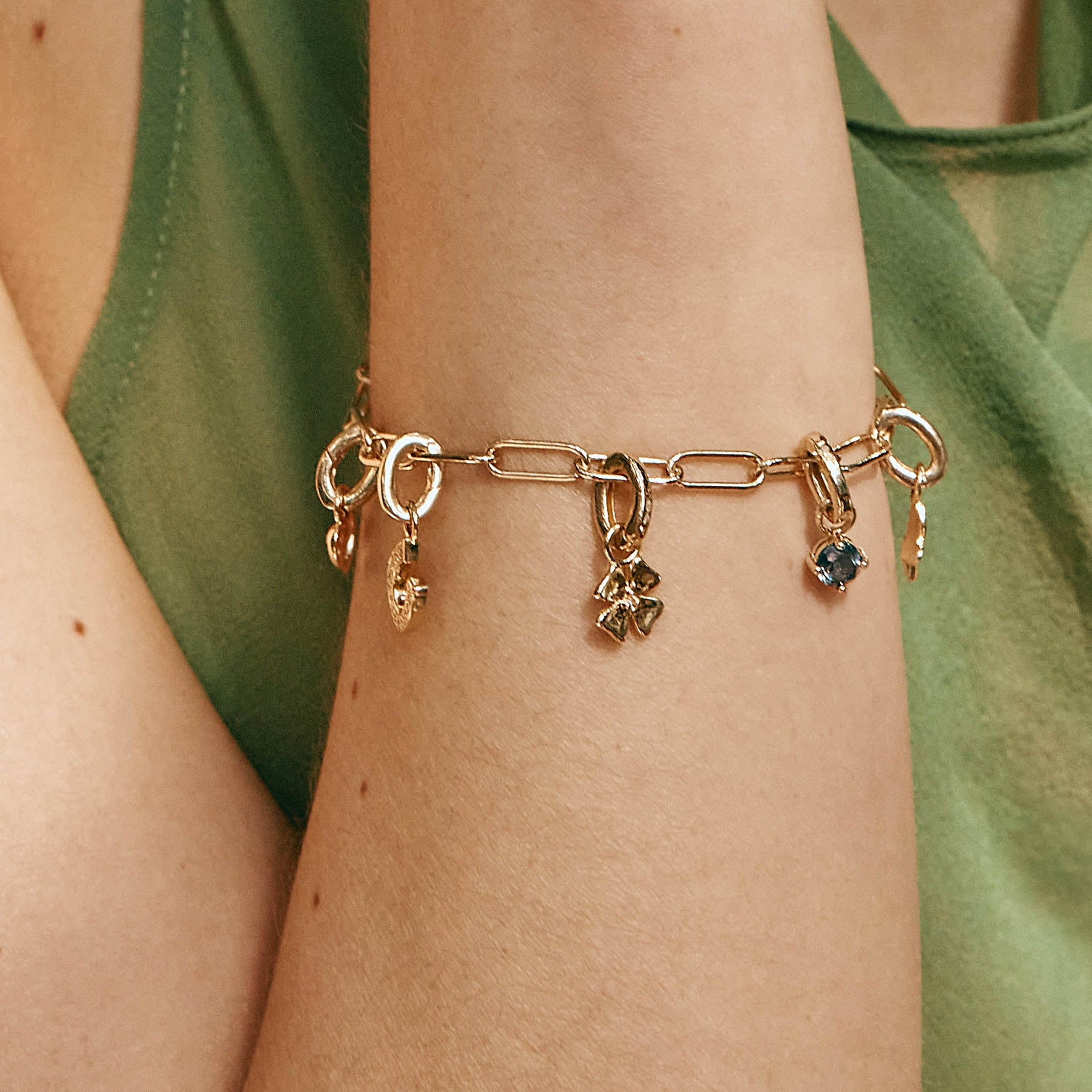 Create your unique, individual jewellery look with this 4 leaf clover charm. Representing good luck, this gold clover dangle charm is crafted in 18k fine gold plating with white topaz. Featuring a compressible adaptor, you can clip this collectable charm onto your favourite chain or bracelet. Use our pendant connectors as an adaptor to wear on any chain, or pair with our specially-designed charm bracelets and necklaces.