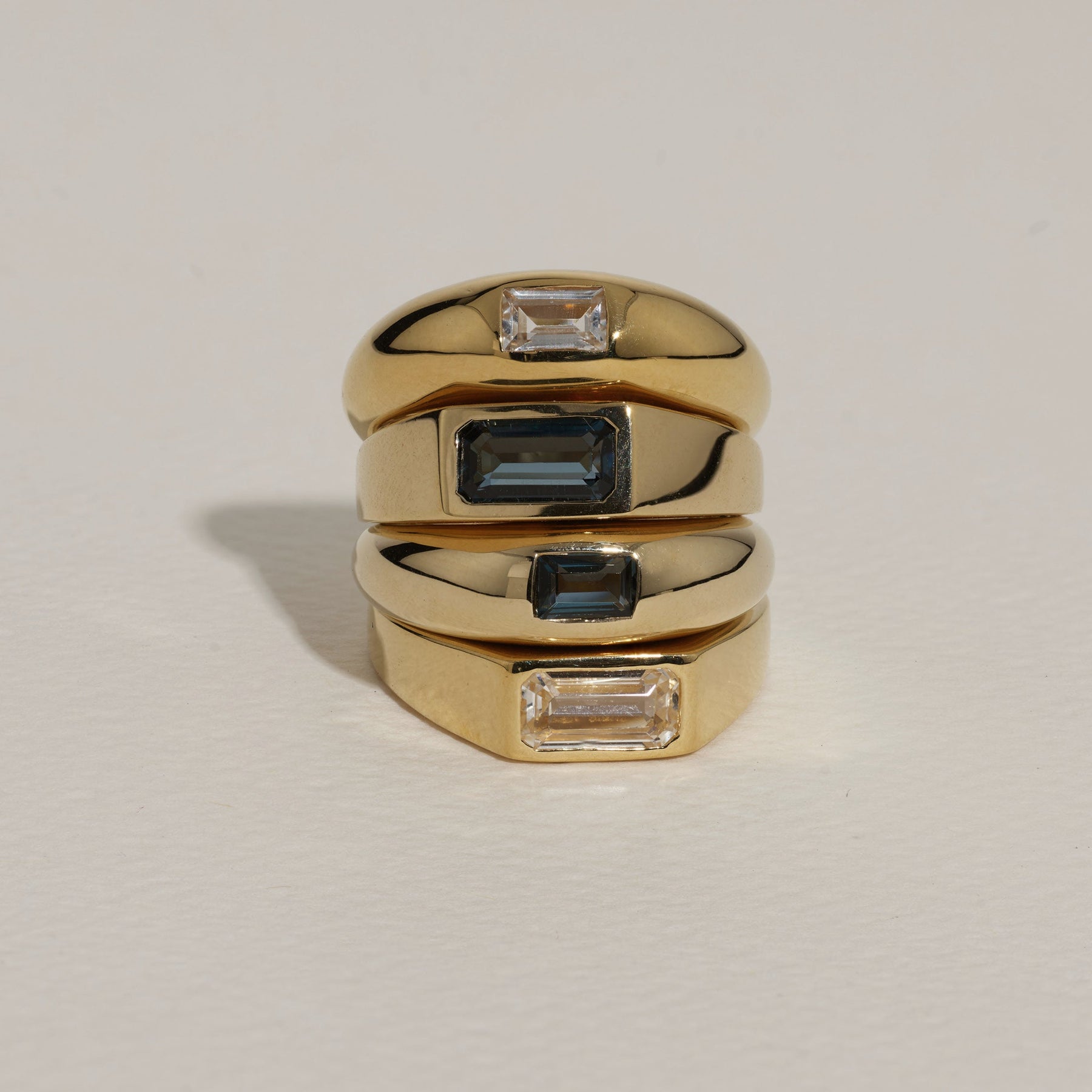 Bring a bold touch to your ring stack with this blue topaz signet ring. Its timeless silhouette is made modern with a statement, emerald cut London Blue topaz as its centrepiece. Crafted in 18k fine gold plating, it's available in five sizes so you can style it as a pinky ring or on whichever digit you prefer.