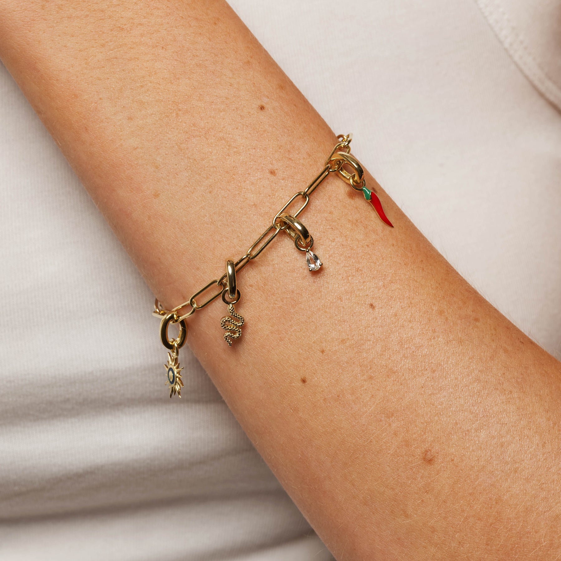 Personalise your style with this symbolic snake charm. Believed to represent transformation, rebirth, and healing, it's a meaningful piece for your collection or to give as a gift. Crafted in 18k fine gold plating. Featuring a compressible adaptor, you can clip this collectable charm onto your favourite chain or bracelet. Use our pendant connectors as an adaptor to wear on any chain, or pair with our specially-designed charm bracelets and necklaces.