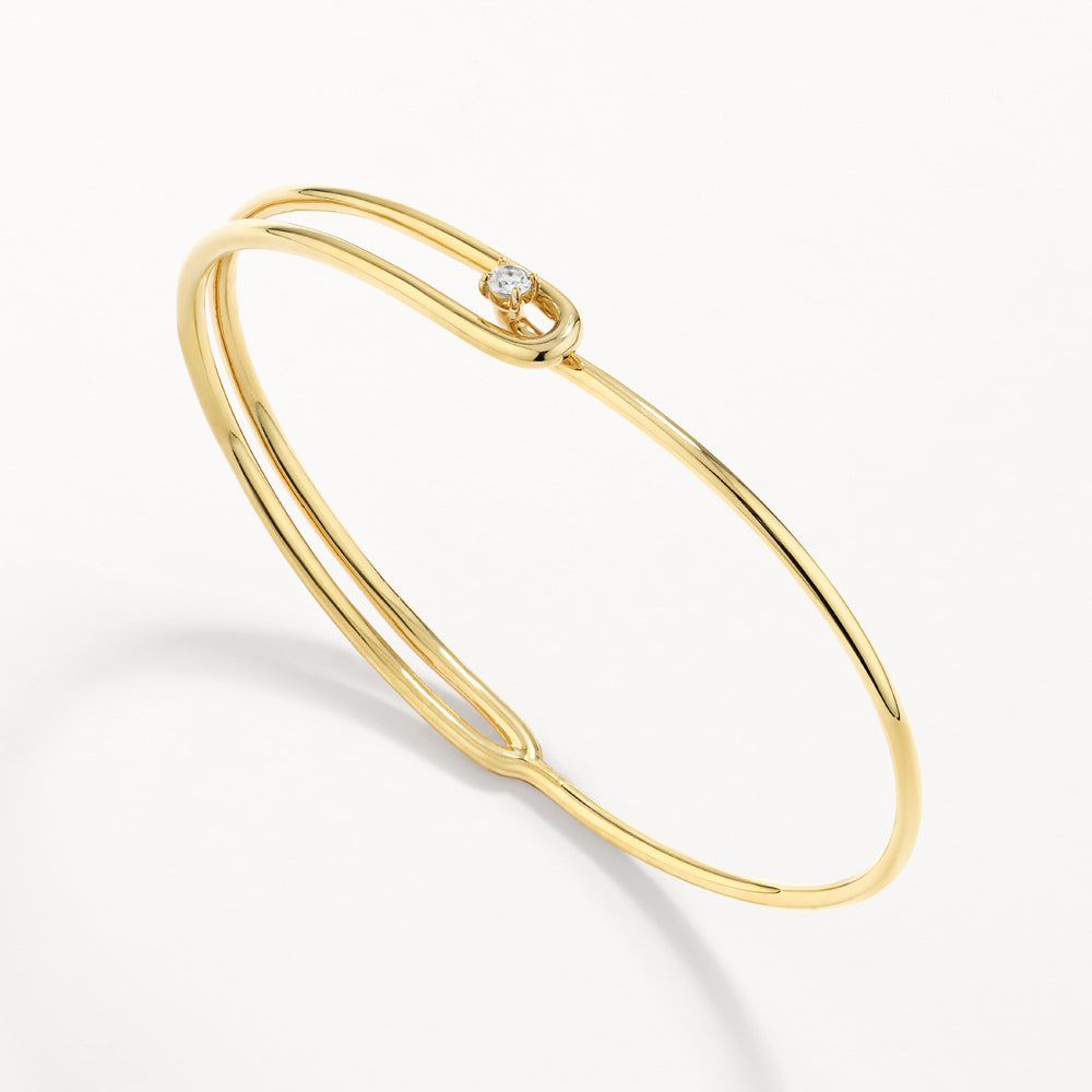 This gold loop bangle is the perfect blend of classic style and unique, modern design. With its loop knot bangle design adorned with a shimmering white topaz, this bangle creates a chic asymmetric look. Crafted in 18k fine gold plating, it features a 60cm diameter.