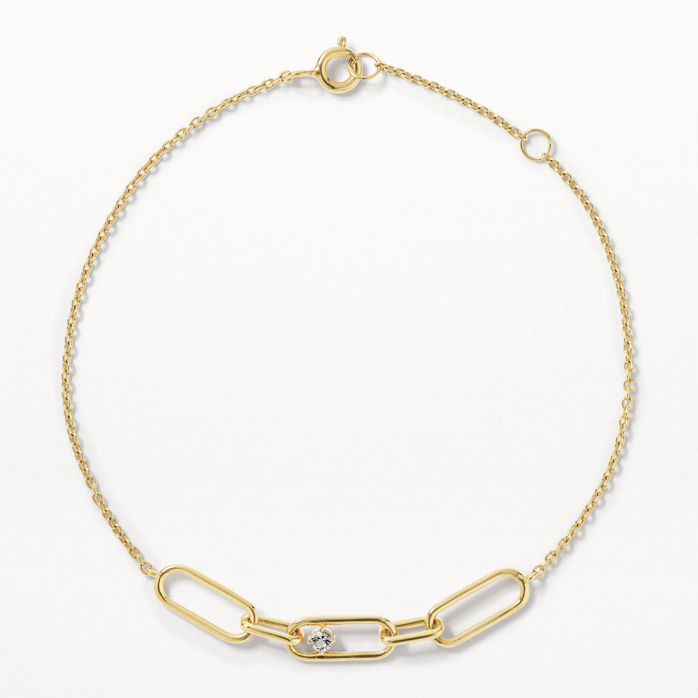 A classic gold bracelet for everyday, with a unique designer touch. This 19cm paperclip bracelet is adorned with three paperclip links and petite white topaz stones for a modern silhouette and touch of shimmer. Crafted in 18k fine gold plating, add this link bracelet to your everyday rotation.